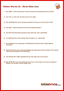 For example if we gave you Jer 10:5 - "Their idols are like scarecrows in a cucumber field, and they cannot speak; they have to be carried, for they cannot walk. Do not be afraid of them, for they cannot do evil, neither is it in them to do good."... you might find the word "crow" hidden in there. See if you can find a type of bird hidden in each Bible verse.